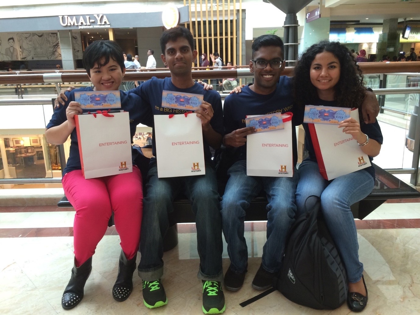 The semi-finals proved a more challenging than the preliminaries. However, it is with utter regret to report that we could not enter the finals. The competition was too tight, and too fierce for us, and we had to leave the arena for more… deserving participants. Nevertheless, Team Ancora Imparo did not return empty-handed. We scored 8th place among 17 teams, which actually exceeded expectations because we joined the competition with the intention of only having fun and wanting to experience joining a game-show. Instead, we gained not only the former two, but walked away with RM 50 MPH vouchers and History Channel goodie bags!