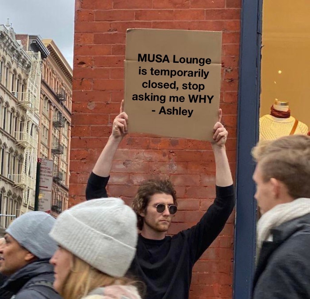If I had RM1 everytime a student asked me why MUSA Lounge wasn’t open throughout this week, I would have enough money to go to HaidiLao every day of the week 🥶 Unfortunately, once again due to the unshakable Ms Rona, MUSA Lounge will be closed for the foreseeable future in an effort to adhere to the COVID-19 guidelines set by campus management and even this Head Writer’s tenacity could not weasel out an opening date from our Welfare Officers. (I’m sowie, I tried 🥺)