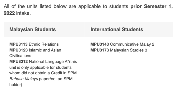 Pro tip from a senior: Get them done during a summer semester, they’re pretty easy honestly. And yes for all SPM-takers do not worry, you are still exempted from taking MPU 3212 if you have a credit in your SPM BM. For IGCSE students such as myself, well… my best advice would just be to bite the bullet and get it over with :(
