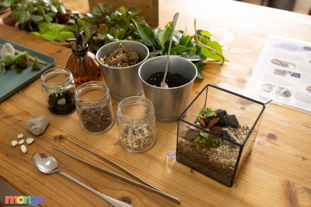As we stepped in, a bell rang, announcing our arrival at the cafe. We were welcomed with such warmth by the staff and lineup of beautiful plants, ready to be “adopted”. The wooden interior and homey decorations successfully comfort us as they contrast the fast-paced life of a university student in the big city. Upon entering the workshop space, we were surprised by a little fellow lurking in the shadows and running towards us. Meet Mocha! One of Jan’s cats is brown and he is shy! Without further ado, we began the terrarium-crafting. If you are curious about how this intricate plant-in-a-box was made, you, too, should come and see for yourself!