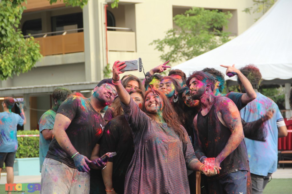 To commemorate the event, the enthusiastic hosts initiated a game to grab a fistful of colours and, after a short countdown, toss it up and scream “Happy Holi!” Even though it feels awkward to scream any sort of greeting as university students pursuing degrees that might essentially determine our future, I watched as the clear blue sky was tainted with falling colours, and students screamed “Happy Holi” in childish joy, giggling at the prospect of getting gently dusted by a kaleidoscope of colours.