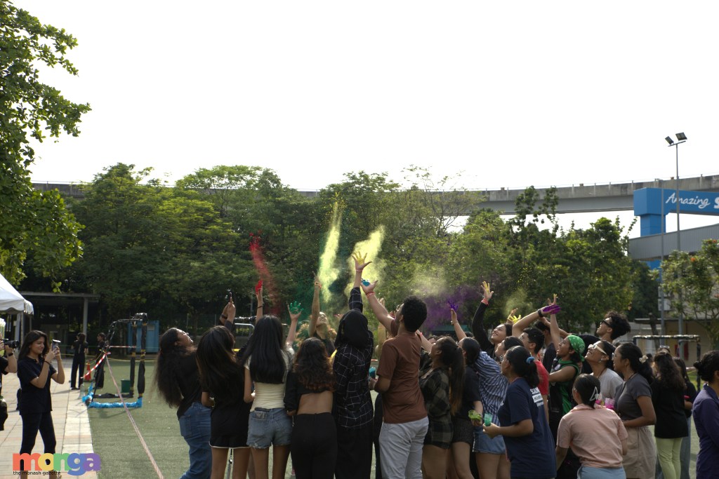 Walking into the event, I was honestly skeptical about how they would recreate this immersive experience—like it had been done in an entire country and numerous well-known Bollywood movies. At the beginning of the event, students slowly trickled in with hesitant faces and nervous smiles as they registered themselves and collected their coloured powders. As part of the dress code, everyone wore light-coloured clothes, and I watched as the crowd on the Monash field grew from a puddle to a sea of pastel-clad students. The air was heavy with joyful anticipation as people held onto those packets of colours like they would fly away.